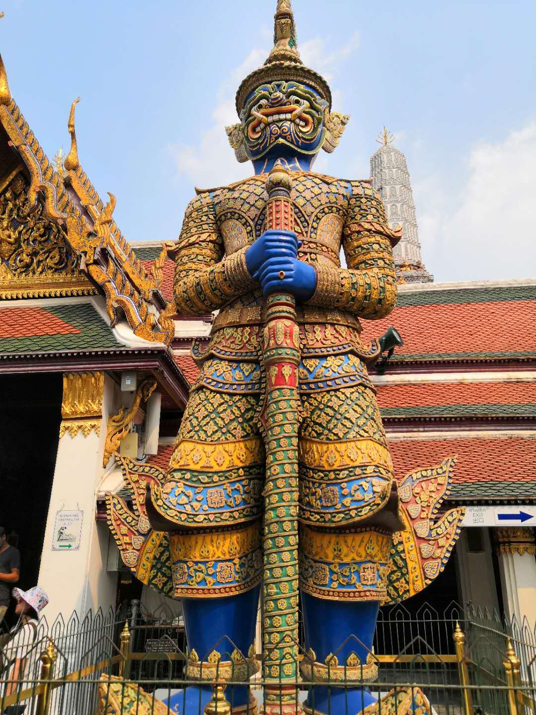 舉世聞名的大皇宮緊鄰著湄南河,是曼谷市中心內(nèi)一處大規(guī)模的古建筑群。走進(jìn)大皇宮庭院,首先映入眼簾的是如茵的大片草地和姿態(tài)各異的古樹,草坪周圍栽有一些菩提樹和其它熱帶樹木。大皇宮的佛塔式的尖頂直插云宵,魚鱗狀的玻璃瓦在陽光照射下,燦爛輝煌。尖角高聳的廟宇、佛塔,在陽光的照耀下,玲瓏剔透、金玉璀璨,雕功細(xì)膩、精致美觀的高大金漆佛像、石雕和繪有泰國傳統(tǒng)圖案的壁畫,記載著與王國和佛教有關(guān)的故事。